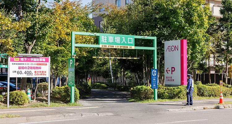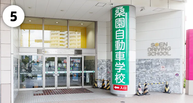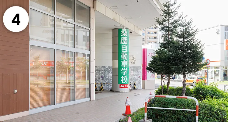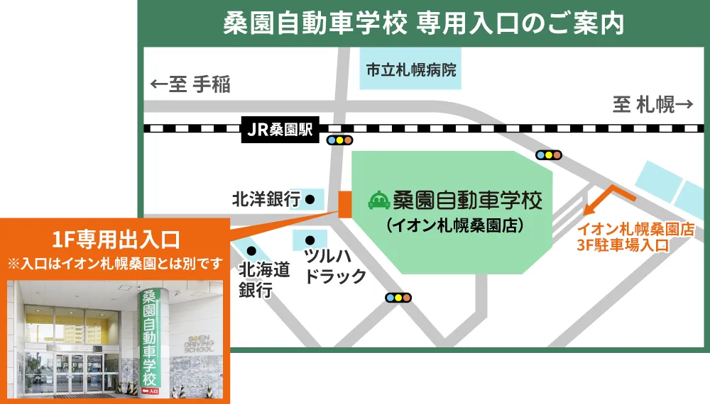 お車でお越しの際は、分かりやすい場所に駐車いただき、屋外にある「桑園自動車学校」入口よりお進みください。