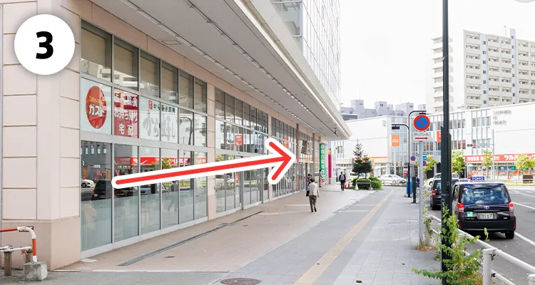 駅を出ると目の前にイオンが見えます。信号を渡ってから右折してください。
