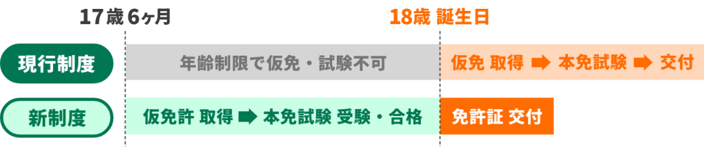 道路交通法改正に伴い、2026年4月1日より、準中型免許と普通免許において、「仮免許の取得可能年齢」と「運転免許試験の受験可能年齢」が、現在の18歳から17歳6ヶ月へ引き下 げられます。
